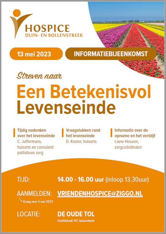 Zo zal huisarts en consulent palliatieve zorg Carla Juffermans iets vertellen over hoe men bij gezondheid al kan nadenken over het levenseinde. En vooral ook hoe je je eventuele wensen kenbaar maakt bij je naasten en huisarts. Huisarts Dick Koster bespreekt de verschillende vraagstukken die er zijn rondom de kwaliteit van leven tijdens het levenseinde en hospicecoördinator Liane Heuzen geeft informatie over de opname en het verblijf in het hospice of het ontvangen van mantelzorgondersteuning door vrijwilligers bij mensen die thuis gaan sterven.