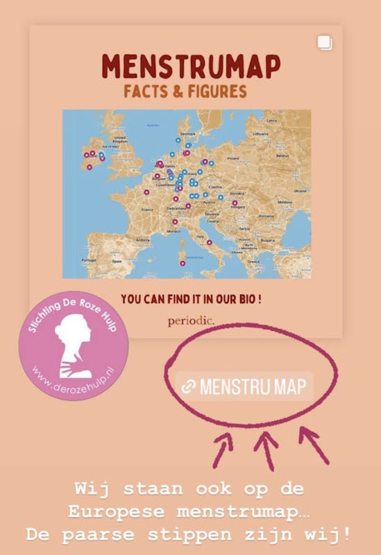 Stichting de roze hulp staat op de Europese Menstrumap van Periodic, op deze Google map kan je menstruatie uitgiften punten vinden.